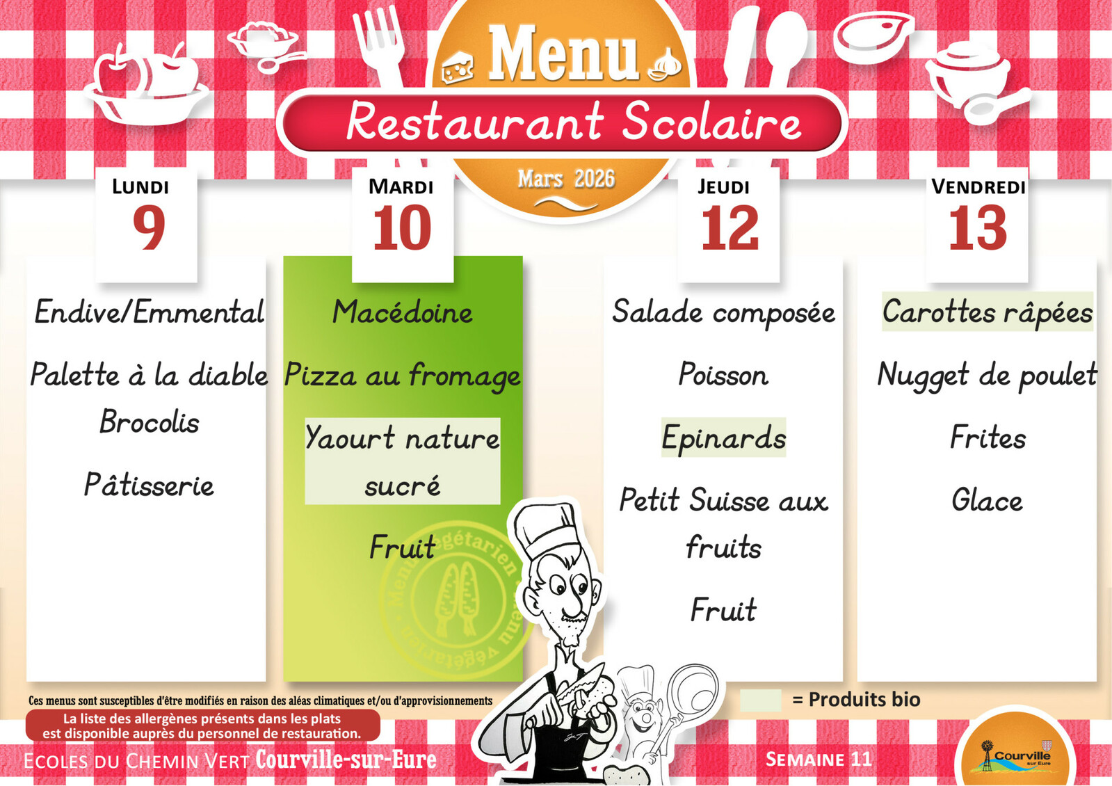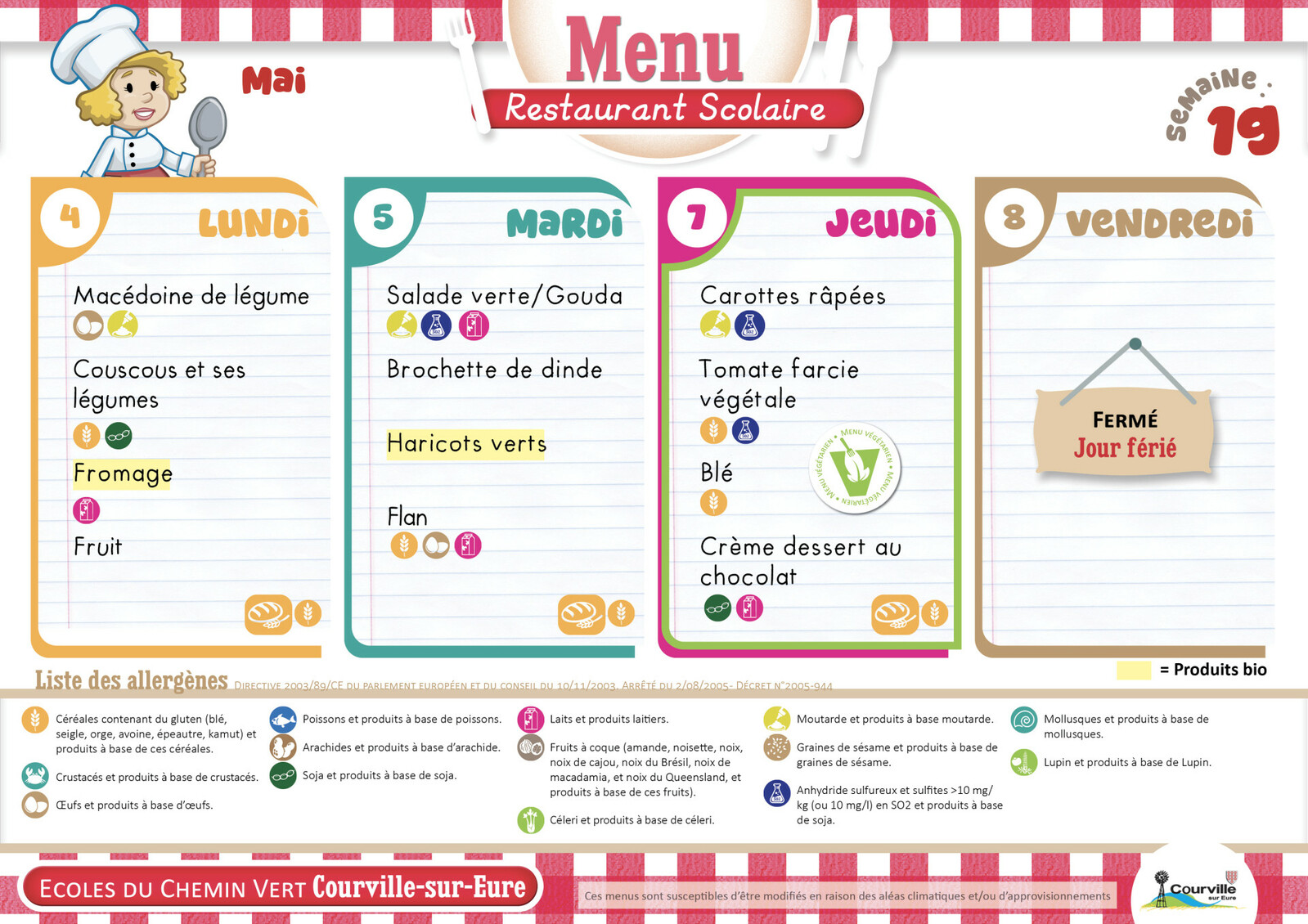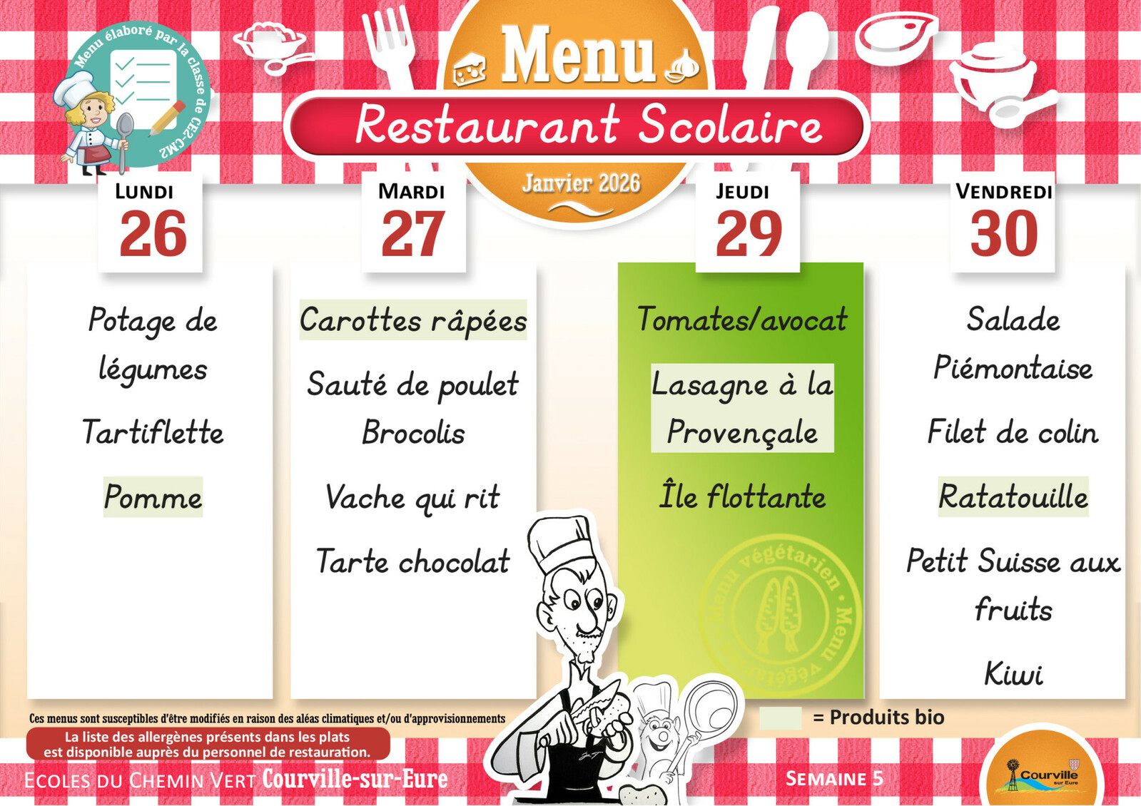 ![]() | Un service de restauration est mis en place pour les élèves des écoles du Chemin Vert et les agents communaux. Toute une équipe est à la tâche chaque matin pour servir les 180 repas journaliers, faits maison avec des produits issus de filières locales. |