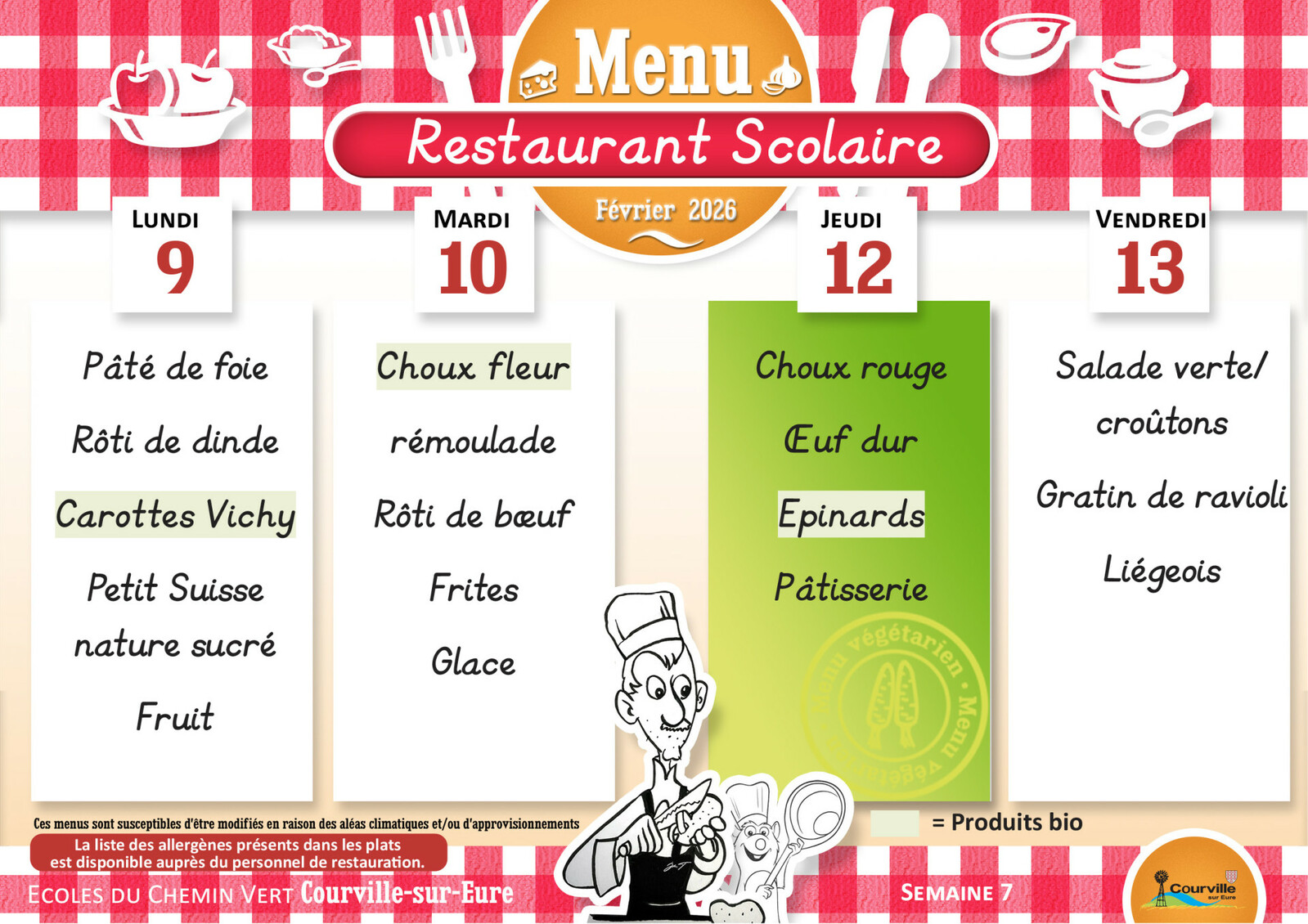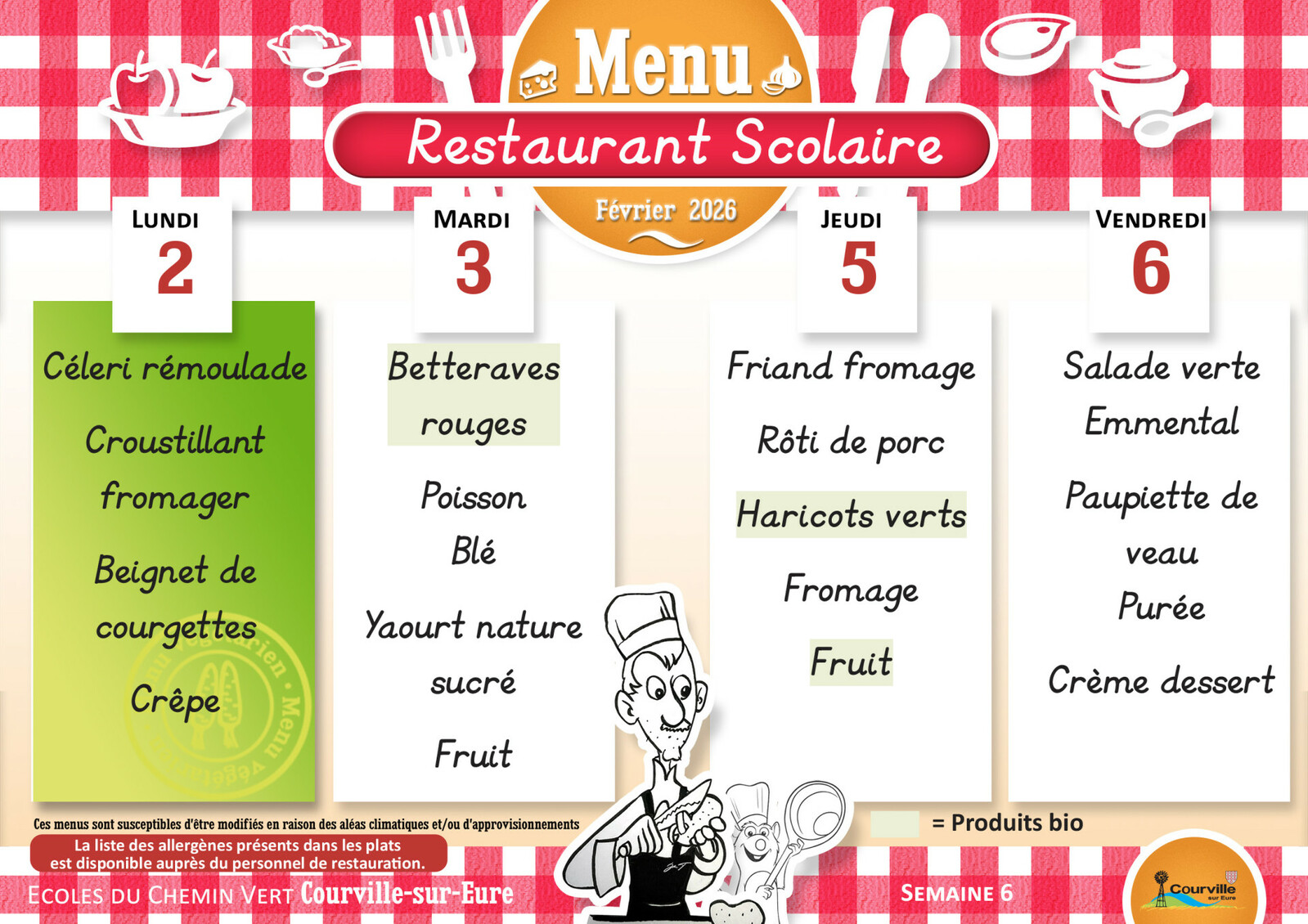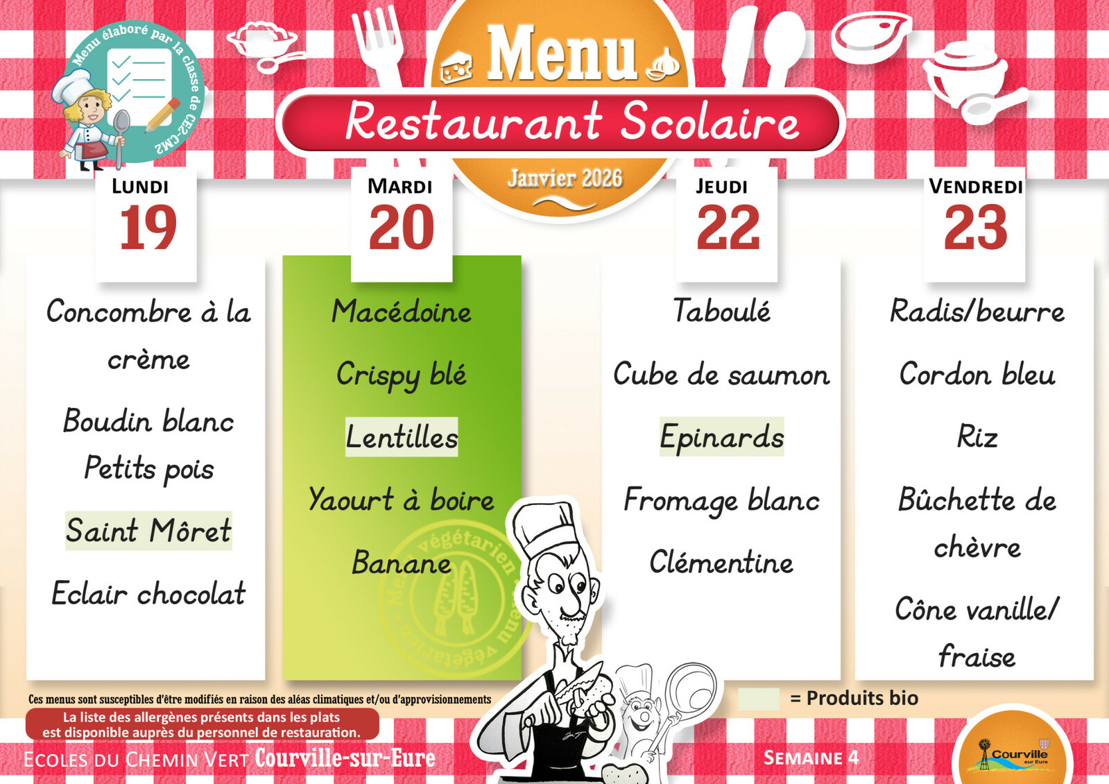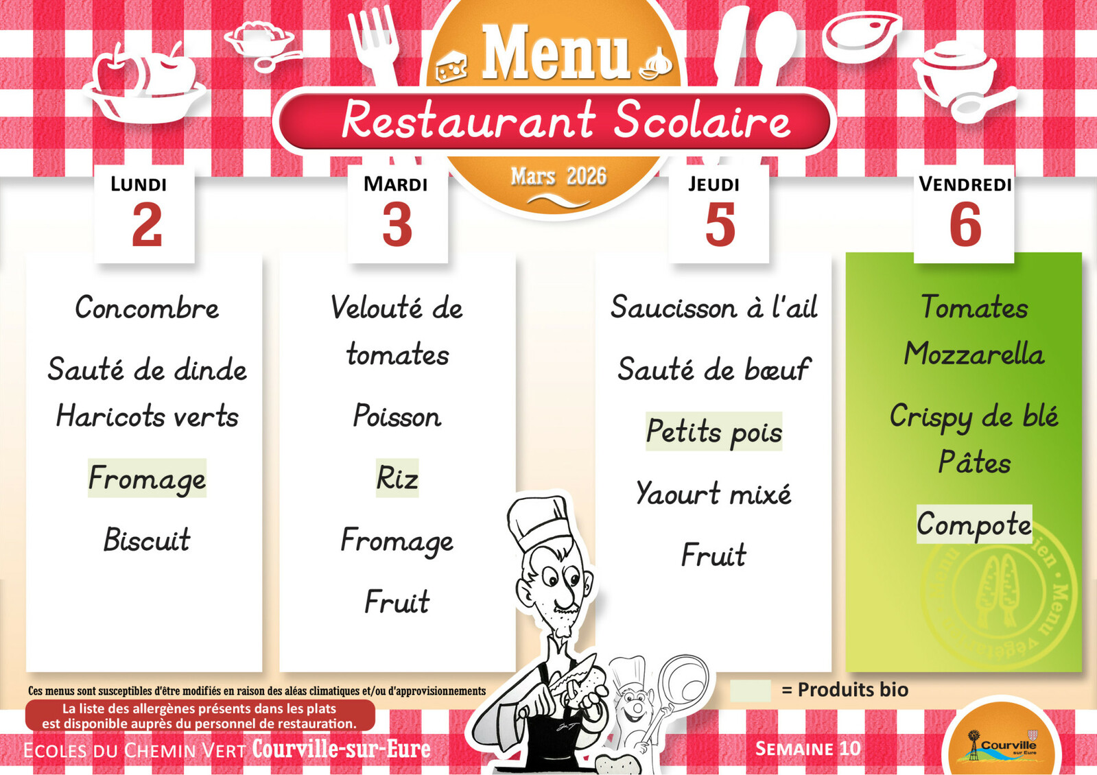 ![]() | Un service de restauration est mis en place pour les élèves des écoles du Chemin Vert et les agents communaux. Toute une équipe est à la tâche chaque matin pour servir les 180 repas journaliers, faits maison avec des produits issus de filières locales. |