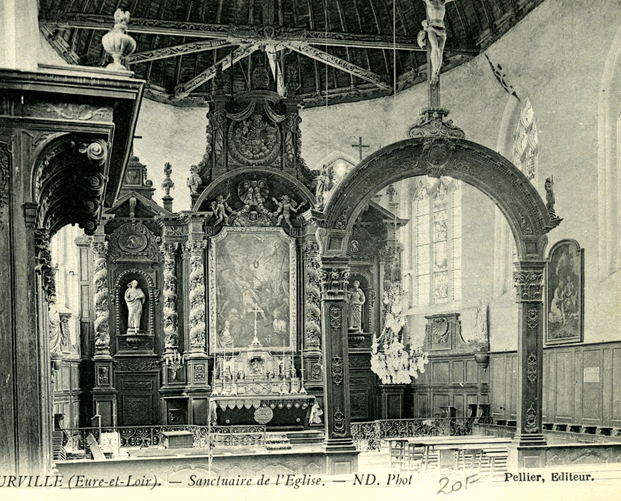 | Le tableau de Courville Le monumental retable qui trône au fond du chœur de l’église Saint Pierre, classé à l’inventaire des monuments historiques en 1906 lui sert d’écrin. Cette imposant chef d’œuvre de menuiserie n’a pas encore révélé tous ses secrets. La tradition locale prétend qu’il était primitivement installé dans l’église Saint Pierre de Chartres (abbaye de Saint-Père-en- Vallée) et fut acheté aux ventes de mobilier des églises supprimés par la Révolution. Il est possible qu’il soit tout simplement issu d’une commande de la fabrique de la paroisse de Courville. Sa date de construction n’est pas connue, nous pouvons envisager de la situer vers 1684 date de l’achat du maître autel. | ![]() |
